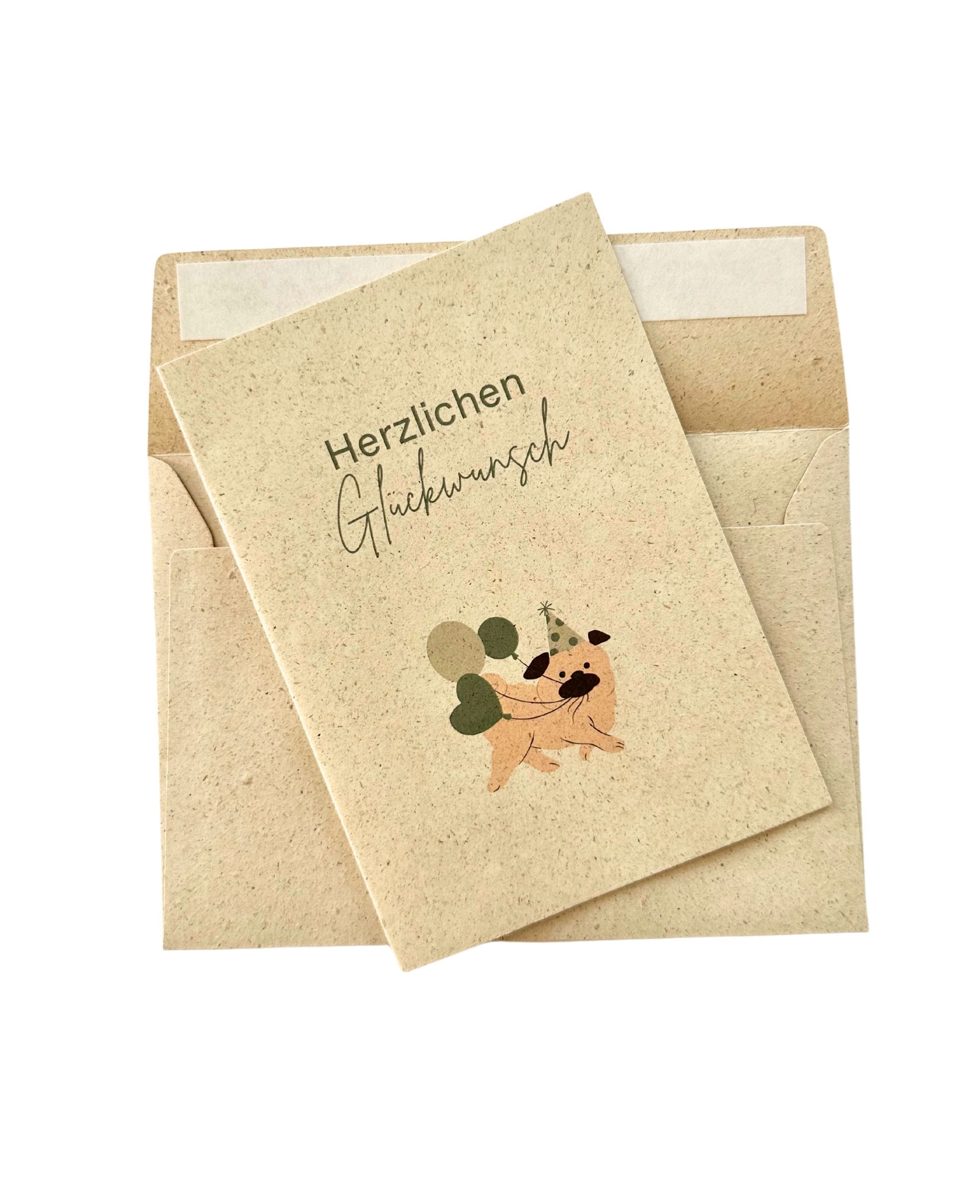 Geburtstagskarte Mops – Herzlichen Glückwunsch | Nachhaltige Graspapierkarte (A6)